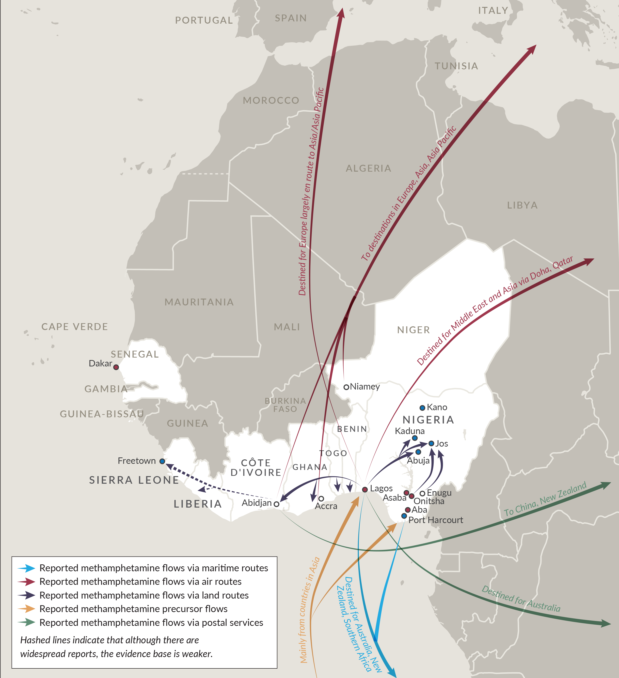 Reported methamphetamine flows in West Africa (Mapping synthetic drug markets in West Africa, GI-TOC, November 2025)
