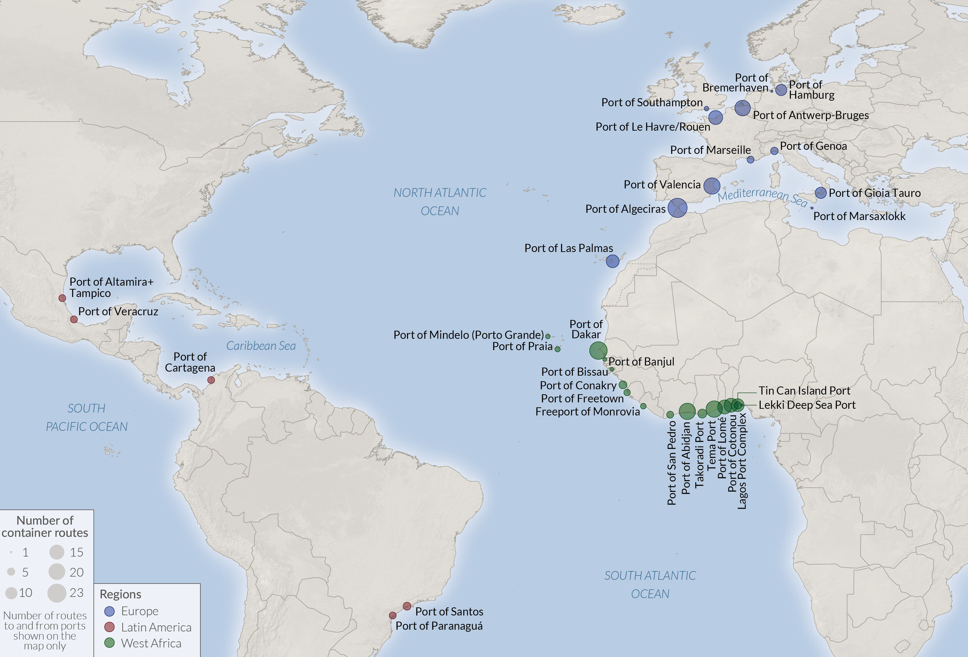 Connections between ports in West Africa, Latin America and Europe.