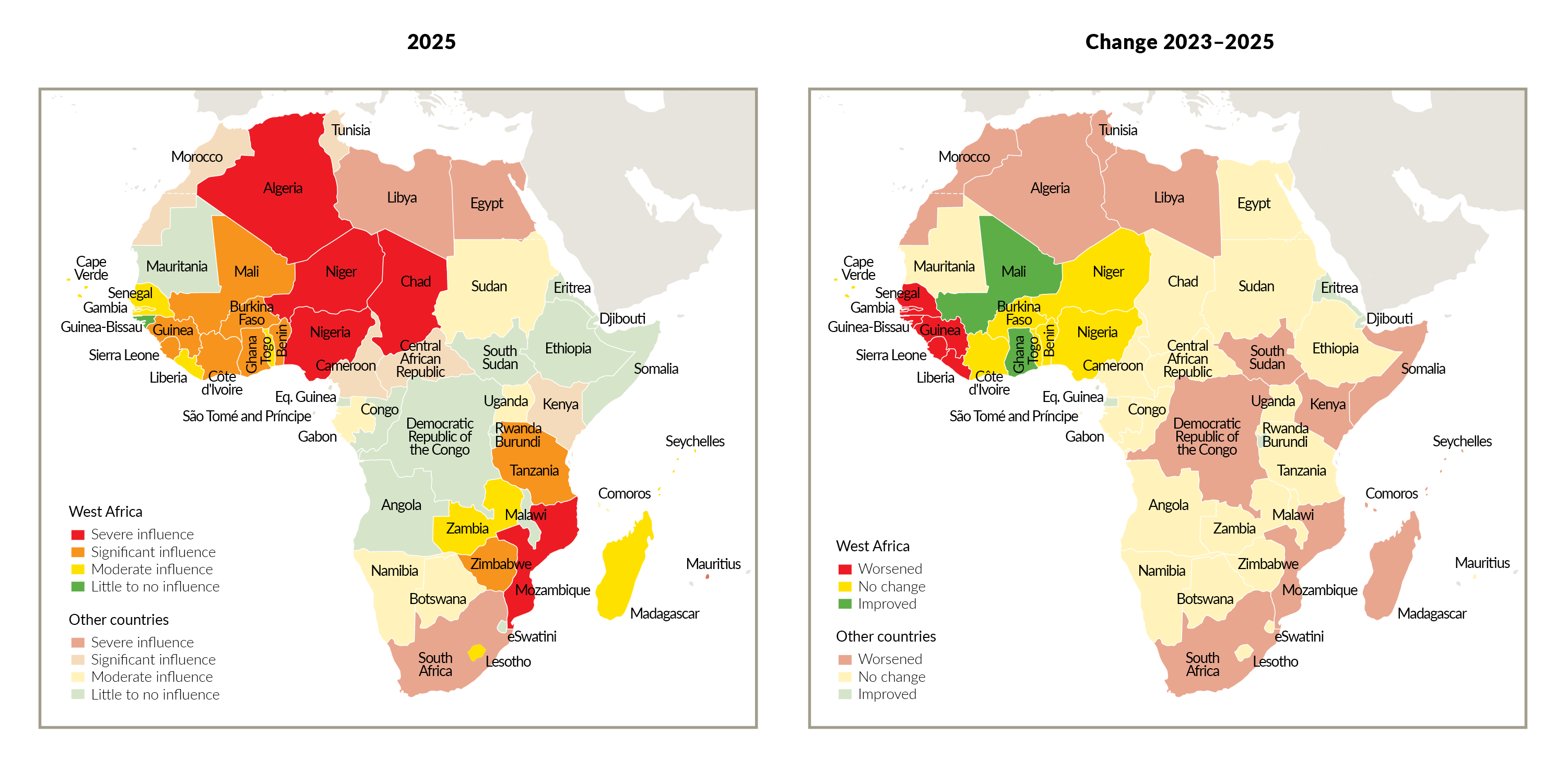 Change in the pervasiveness of the criminal market for synthetic drugs, 2023–2025 (Global Organized Crime Index, GI-TOC, 2025 - ocindex.net)